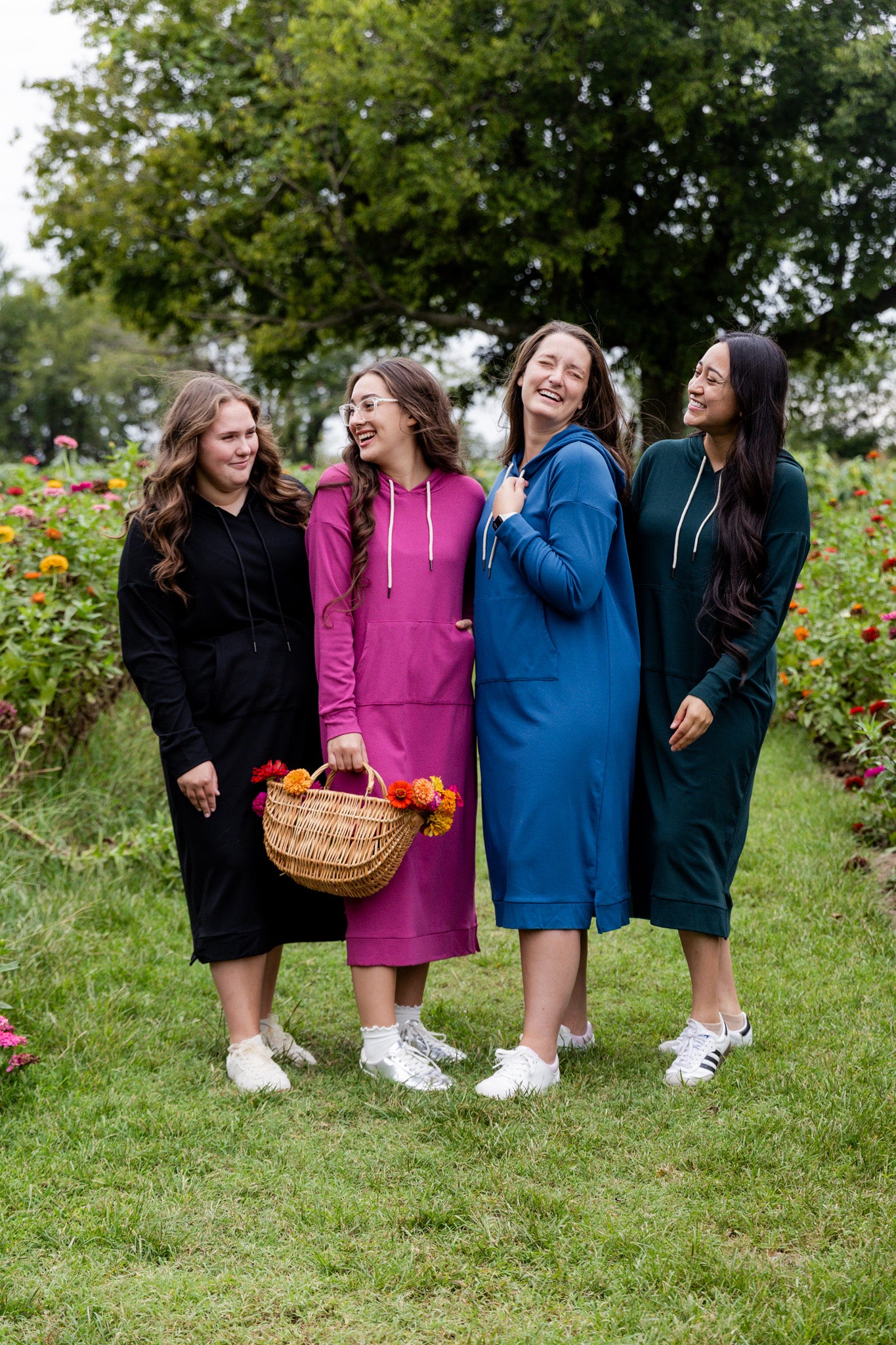 The Nuggles® Hoodie Dress is the perfect blend of cozy comfort, modest style, and everyday versatility. Designed with soft, breathable fabric, this women’s hoodie dress combines the relaxed feel of your favorite sweatshirt with the elegance of a midi-length dress. Featuring long sleeves, a modest midi cut, a functional drawstring hood, and a roomy kangaroo pocket, it’s the ultimate wardrobe staple for women who want to feel comfortable and stylish without compromising modesty. Side slits add easy movement, making this dress as practical as it is chic.