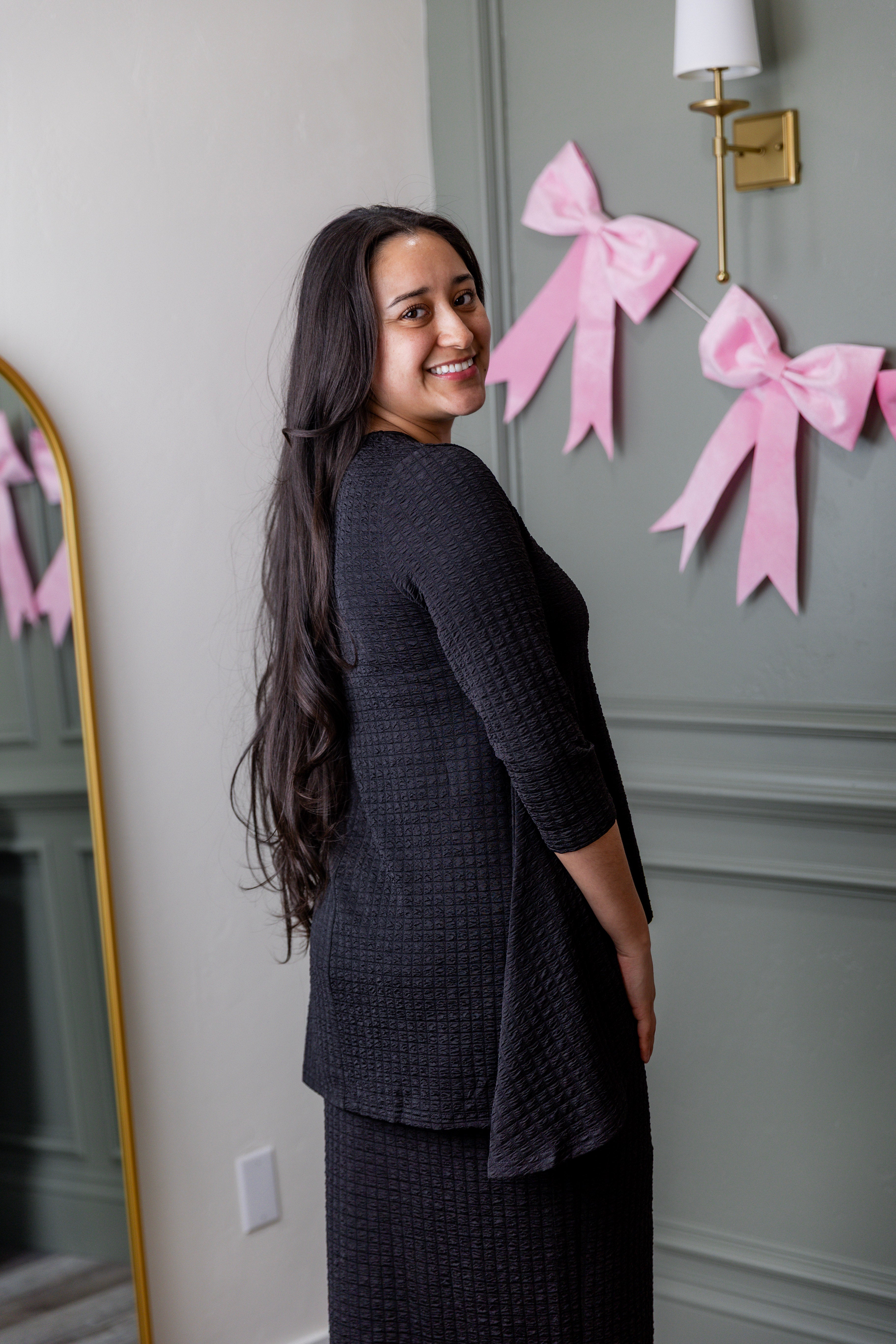 The Eleanor Top is crafted from soft, textured fabric with a timeless A-line silhouette. A statement bow at the neckline—made from the same fabric and color as the top—adds a polished, cohesive touch. Finished with three-quarter sleeves and an easy drape, it’s a comfortable yet refined piece for everyday wear or special occasions.