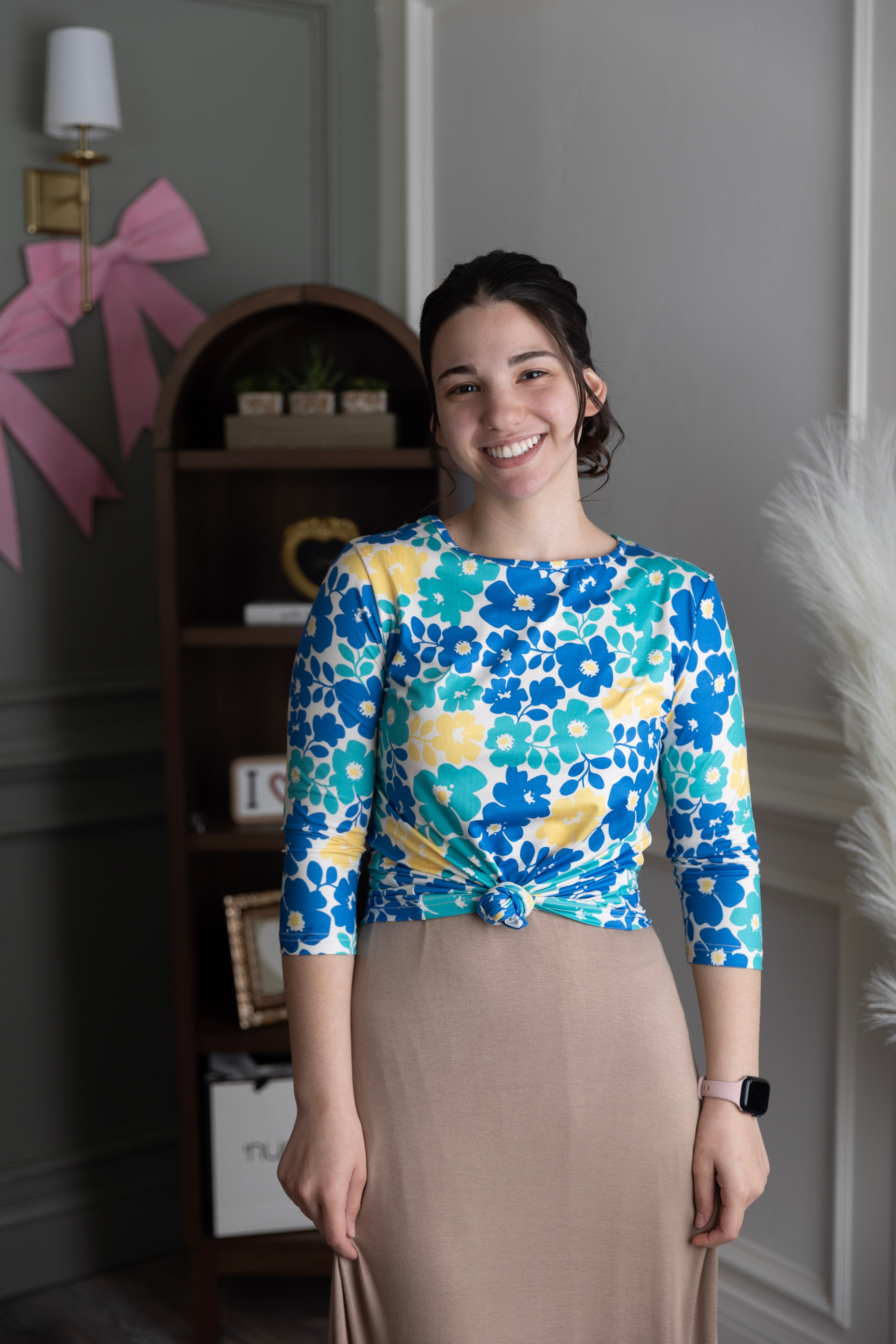 The gentle blend of blues and florals creates a fresh, easy look, while the lightweight, breathable fabric keeps you comfortable all day long. Designed with stretch and softness, it layers smoothly without feeling bulky.